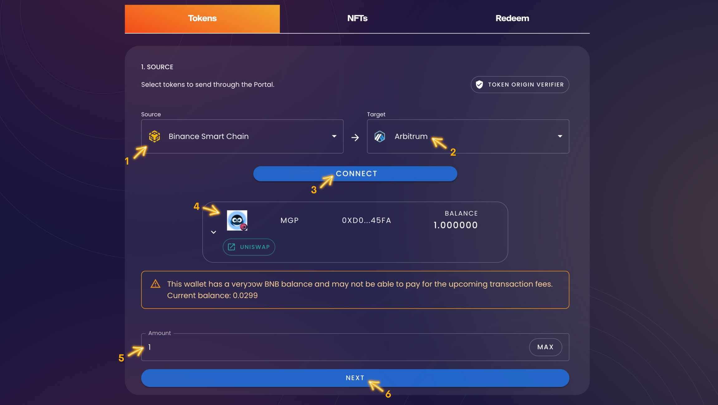 5. Enter the amount of MGP tokens that you want to bridge from BNB Chain to Arbitrum