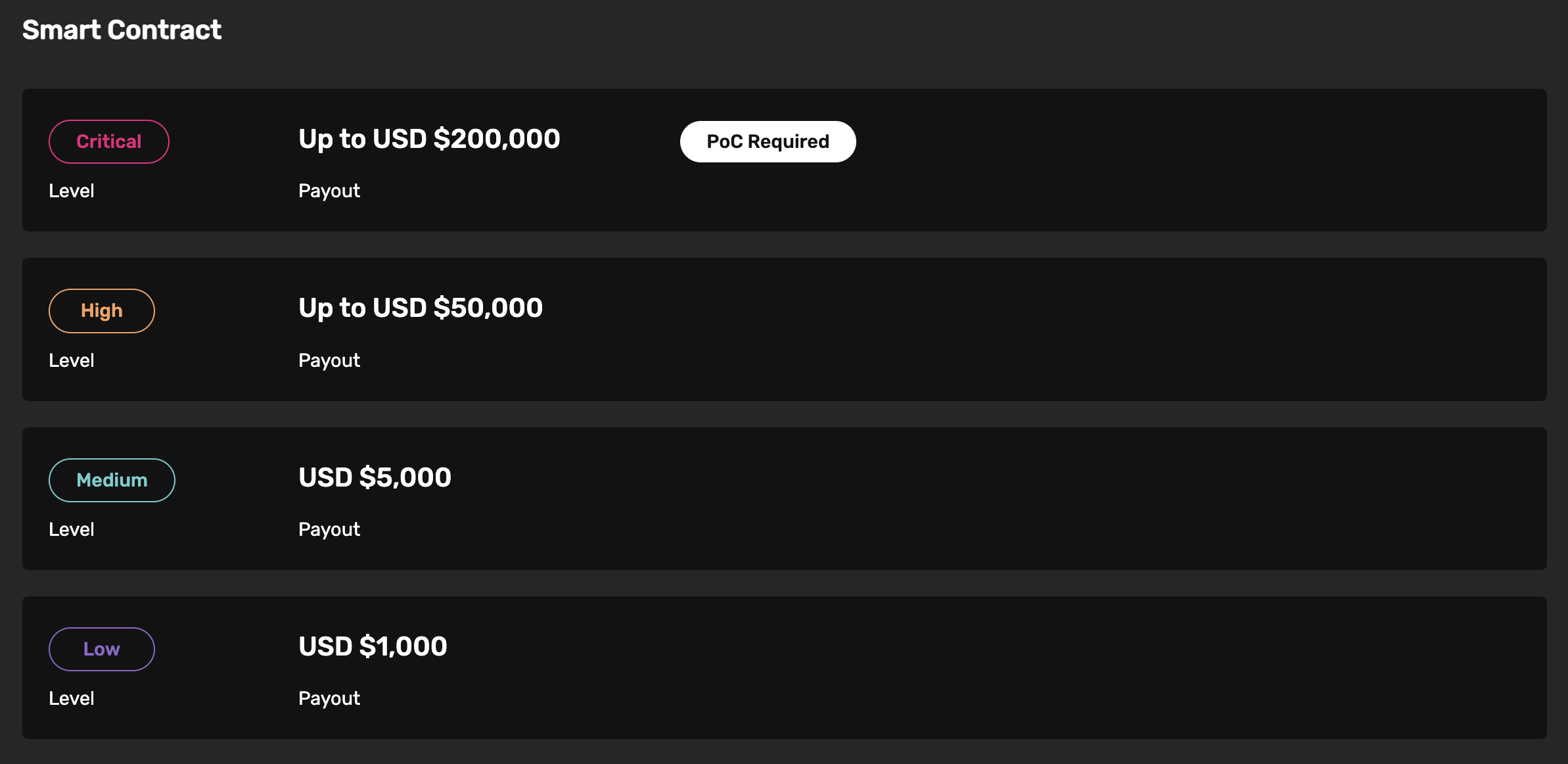 Rewards are distributed according to the impact of the vulnerability based on the Immunefi Vulnerability Severity Classification System V2.2. This is a simplified 5-level scale, with separate scales for websites/apps, smart contracts, and blockchains/DLTs, focusing on the impact of the vulnerability reported.
