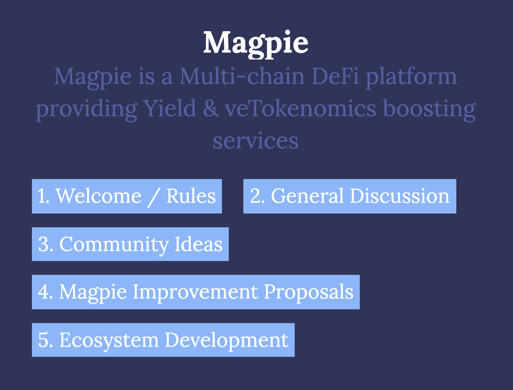 Users can join our Governance Forum to suggest changes to Magpie and take part in the discussion with other investors. The General Discussion channel and the Community Ideas channel are created with the goal of fostering user participation. The core contributors of Magpie will review users opinions and engagement within the forum to consider implementations moving forward.